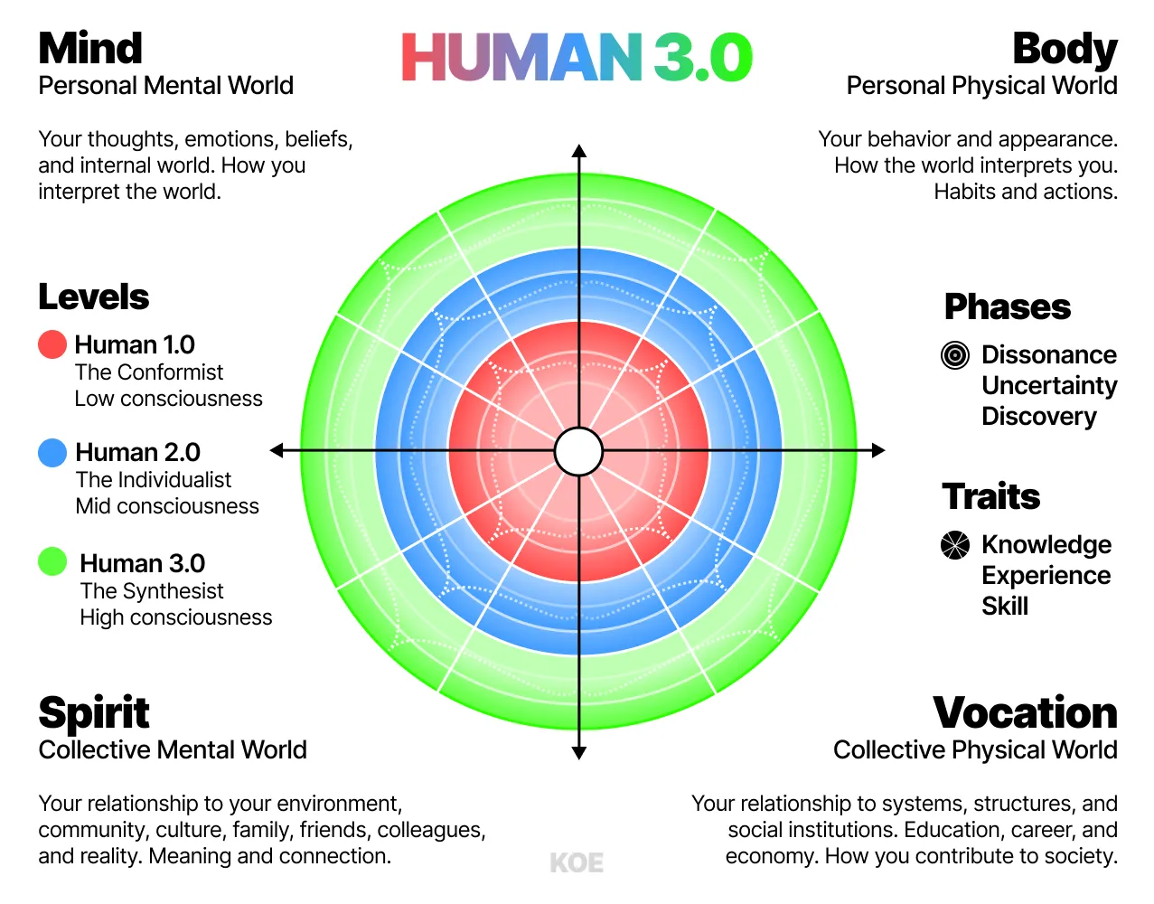 human 3.0 is a comprehensive framework for becoming “multidimensionally jacked”—maximizing potential across all life domains rather than specializing in one. it synthesizes patterns from spiral dynamics, ken wilber’s aqal model, 9 stages of ego development, flow psychology, ancient philosophy, and modern vocational theory. the model addresses the critical flaw of single-domain frameworks by integrating mind, body, spirit, and vocation into one navigable map for modern life.